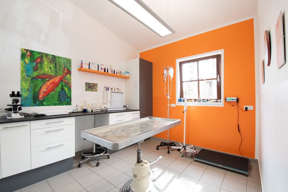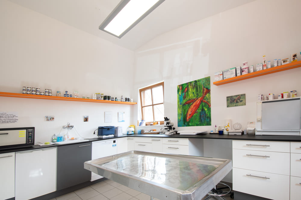 Im großzügigen Praxisraum dürfen sich Katzen und Hunde frei bewegen und können sich während der Anamnese in aller Ruhe umsehen.